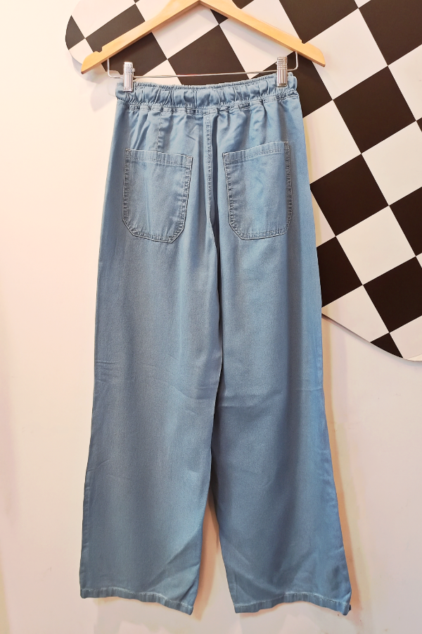 Pantalón de denim liviano, con calce relajado y pierna ancha recta, elástico en cintura y cordón, bolsillos delanteros y traseros