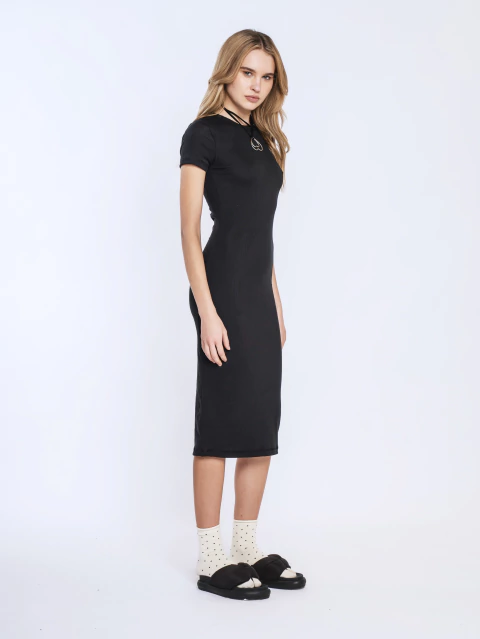 Vestido mangas cortas de morley viscosa con tajo atrás, largo abajo de la rodilla, ajustado al cuerpo